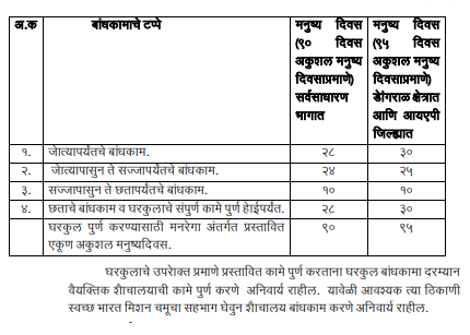 २) इंदिरा आवास योजनेच्या नमूना अंदाजपत्रकाप्रमाणे अंदाजित २० स्क्वे. मीटरचे बांधकाम गृहित धरून टप्पानिहाय अपेक्षित अकुशल निर्मित मनुष्य दिवस पुढीलप्रमाणे राहील.