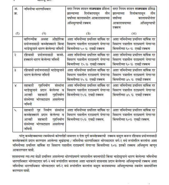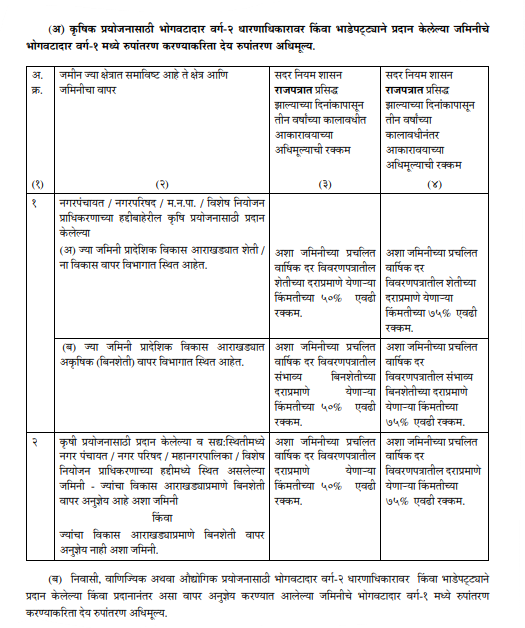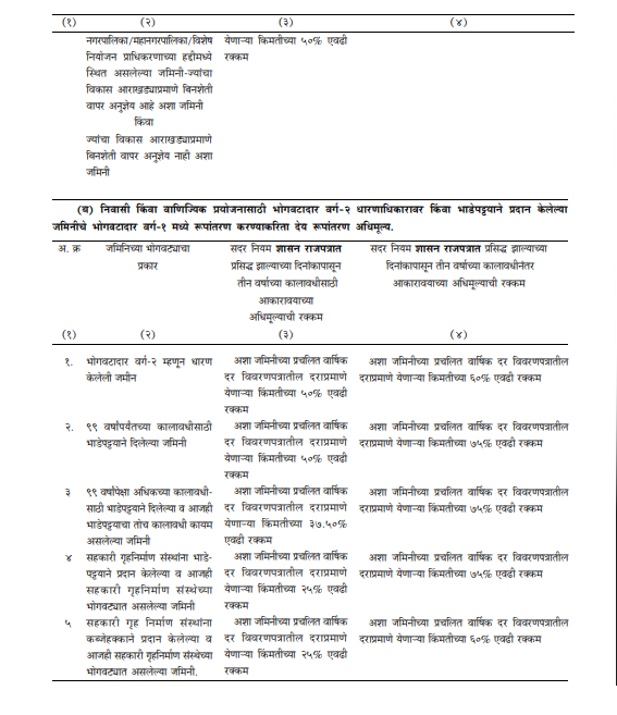 ४) निवासी व वाणिज्यिक किंवा निवासी व औद्योगिक अशा मिश्र प्रयोजनासाठी भाडेपट्टयाने अथवा कब्जेहक्काने भोगवटादार वर्ग-२ धारणाधिकारावर प्रदान करण्यात आलेल्या किंवा असा मिश्र वापर अनुज्ञेय करण्यात आलेल्या भूखंड / जमिनीचा धारणाधिकार भोगवटादार वर्ग-१ मध्ये रूपांतरीत करताना अशा रुपांतरणासाठी शासनास देय असलेले अधिमूल्य त्या त्या वापराखालील क्षेत्राच्या प्रमाणात व अशा वापरास लागू असलेल्या अधिमूल्याच्या दराप्रमाणे आकारण्यात यावे.