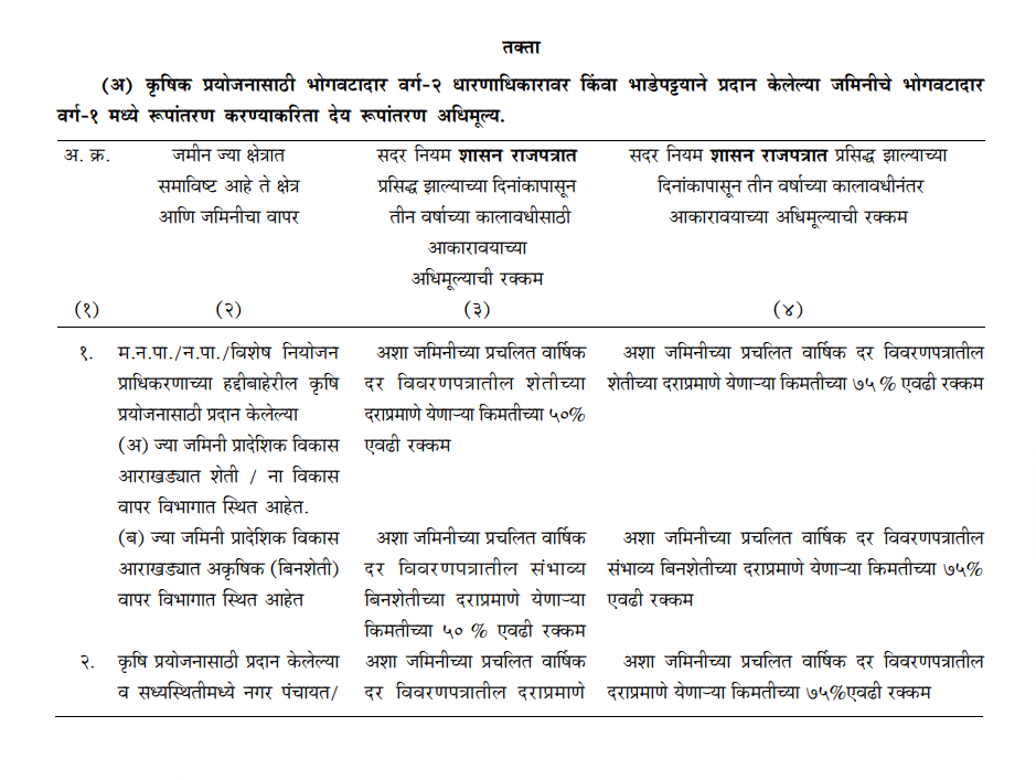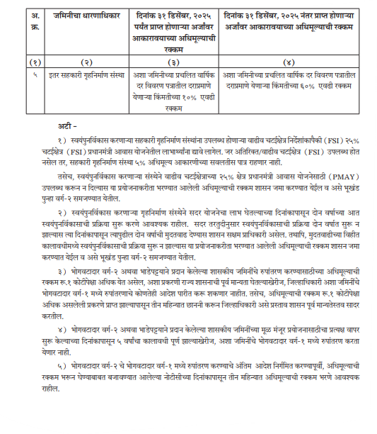 “परंतु, भोगवटादार वर्ग-२ अथवा भाडेपट्ट्याने प्रदान केलेल्या शासकीय जमिनीचे रूपांतरण करण्यासाठीच्या अधिमूल्याची रक्कम रु. १ कोटीपेक्षा अधिक येत असेल, अशा प्रकरणी राज्य शासनाची पूर्वमान्यता (जमीन प्रदान केलेल्या सहकारी गृहनिर्माण संस्था वगळून) घेतल्या खेरीज, जिल्हाधिकारी, अशा जमिनींचे भोगवटादार वर्ग-१ मध्ये रुपांतरणाचे कोणतेही आदेश पारीत करू शकणार नाहीत.”