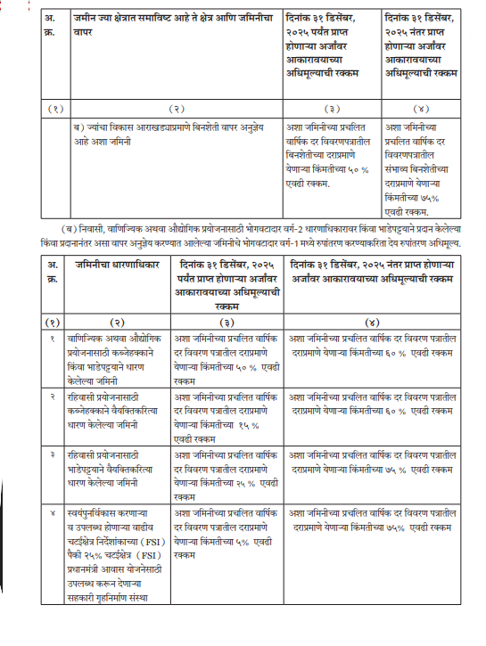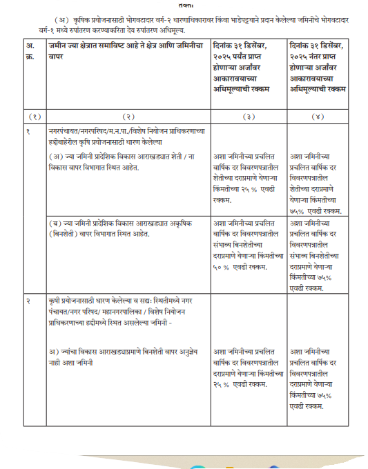 ६) सदर अधिसूचनेतील तरतूदी या महाराष्ट्र शेतजमीन (जमीन धारणेची कमाल मर्यादा) अधिनियम, १९६१ अंतर्गत प्रदान केलेल्या जमिनींना लागू होत नाहीत.७) निवासी, वाणिज्यिक अथवा औद्योगिक प्रयोजनासाठी भोगवटादार वर्ग-२ धारणाधिकारावर किंवा भाडेपट्टयाने प्रदान केलेल्या किंवा प्रदानानंतर असा वापर अनुज्ञेय करण्यात आलेल्या जमिनीचे भोगवटादार वर्ग-१ मध्ये रुपांतरण करताना, एखादया जमिनीचा / भुखंडाचा विधिवत वापरात बदल अस्तित्वातील कायदा, नियम, अथवा शासन निर्णय, आदेशान्वये अनुज्ञेय केला असेल, तर असा अनुज्ञेय वापरातील बदल विचारात घेऊन अधिमूल्य आकारावे.